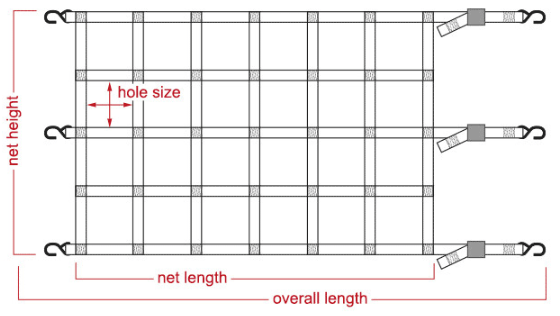 Our nets can be made with 1" or 2" polyester webbing in a variety of color options. We offer tie down hardware to match all types of anchor points, including wire hooks, flat hooks, snap hooks, grommets, and round rings.