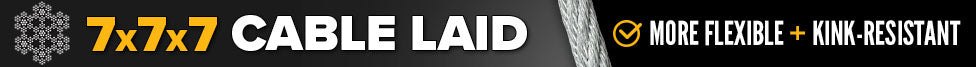 Cable laid slings are manufactured using a 7x7x7 galvanized wire rope (7 strands of 7x7 cables), they offer more flexibility and resistance to kinking than regular wire rope. Also sometimes known as aircraft cable, its narrow profile and pliability make it ideal for applications that require the rope to bend easily. These flexible wire rope slings are also galvanized to offer protection from corrosion.
