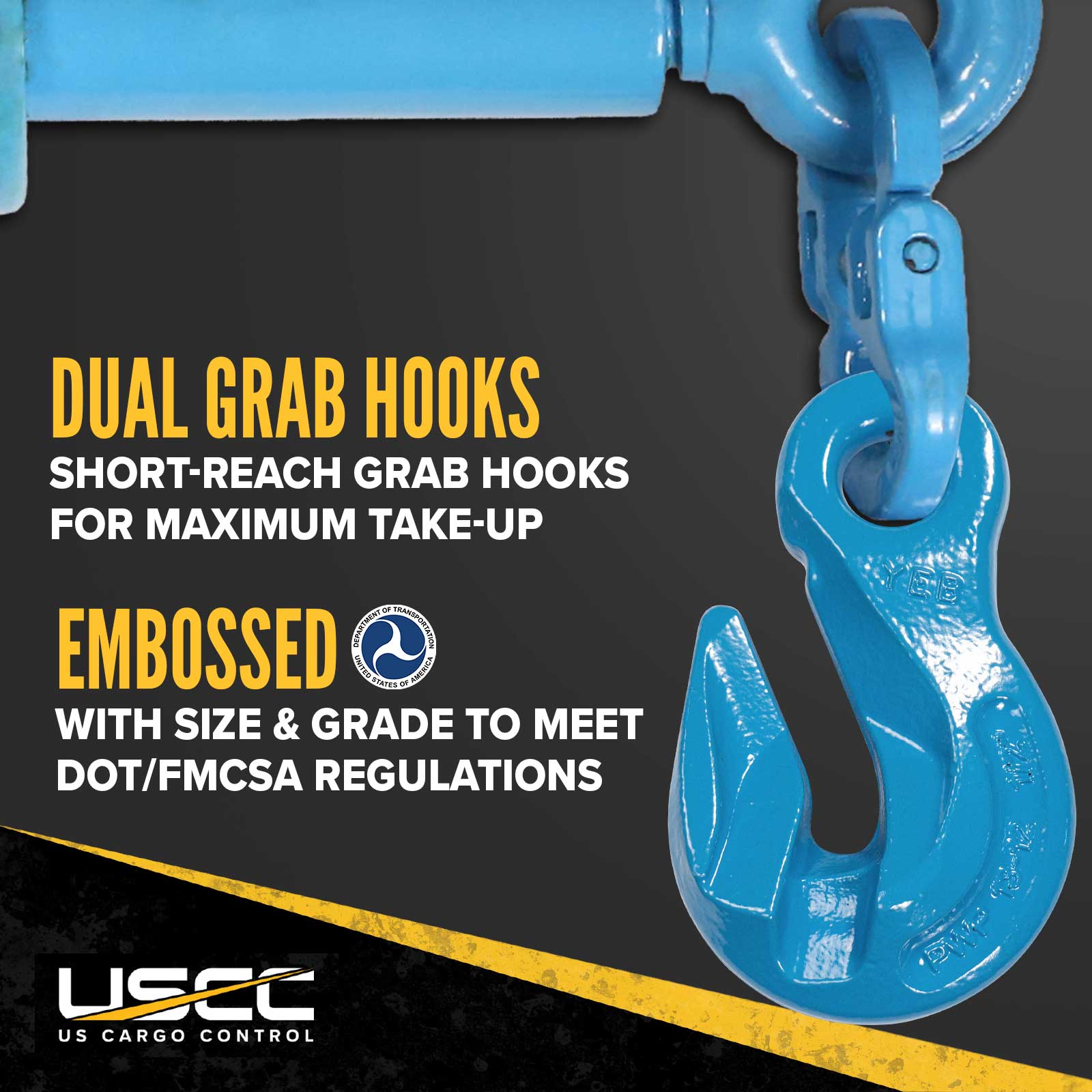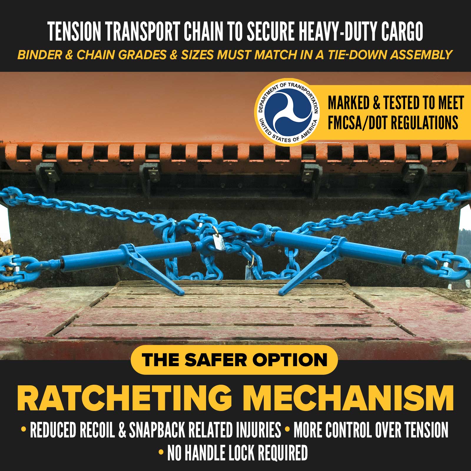 All of our chain binders are stamped and tested to meet DOT compliance, exceeding FMCSA and WSTDA T-6 recommended standards. Each handle is marked with the working load limit, and the hooks are clearly marked with grade and size for quick identification and hassle-free inspections.