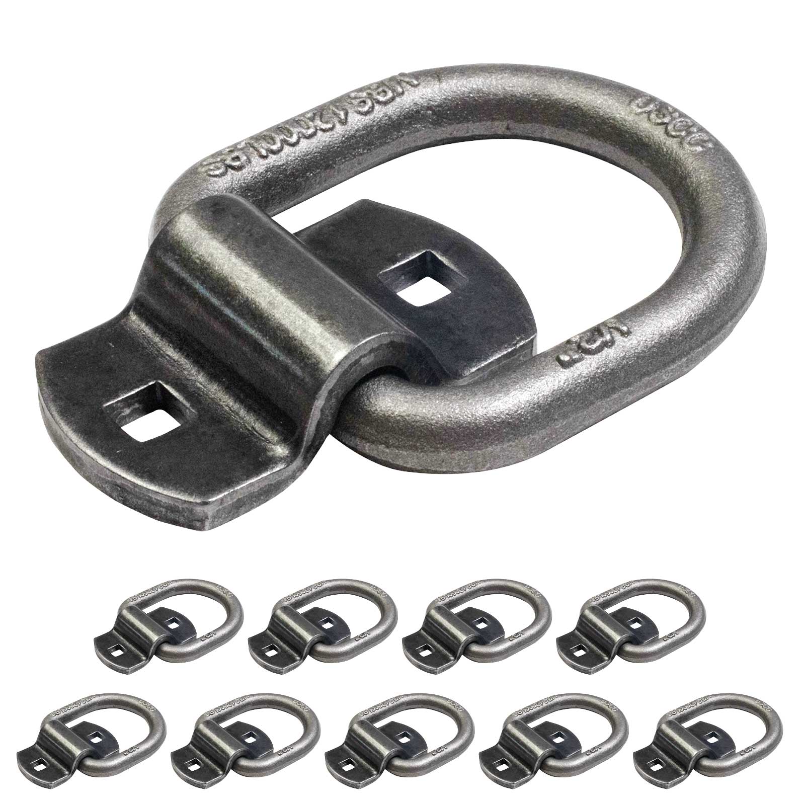 This D-ring can be either bolted or welded on, and comes with pre-drilled holes for easy mounting. Because D-rings are only as strong as the hardware they are mounted with, best practice is to bolt all the way through the material they are mounted to to achieve the highest strength.