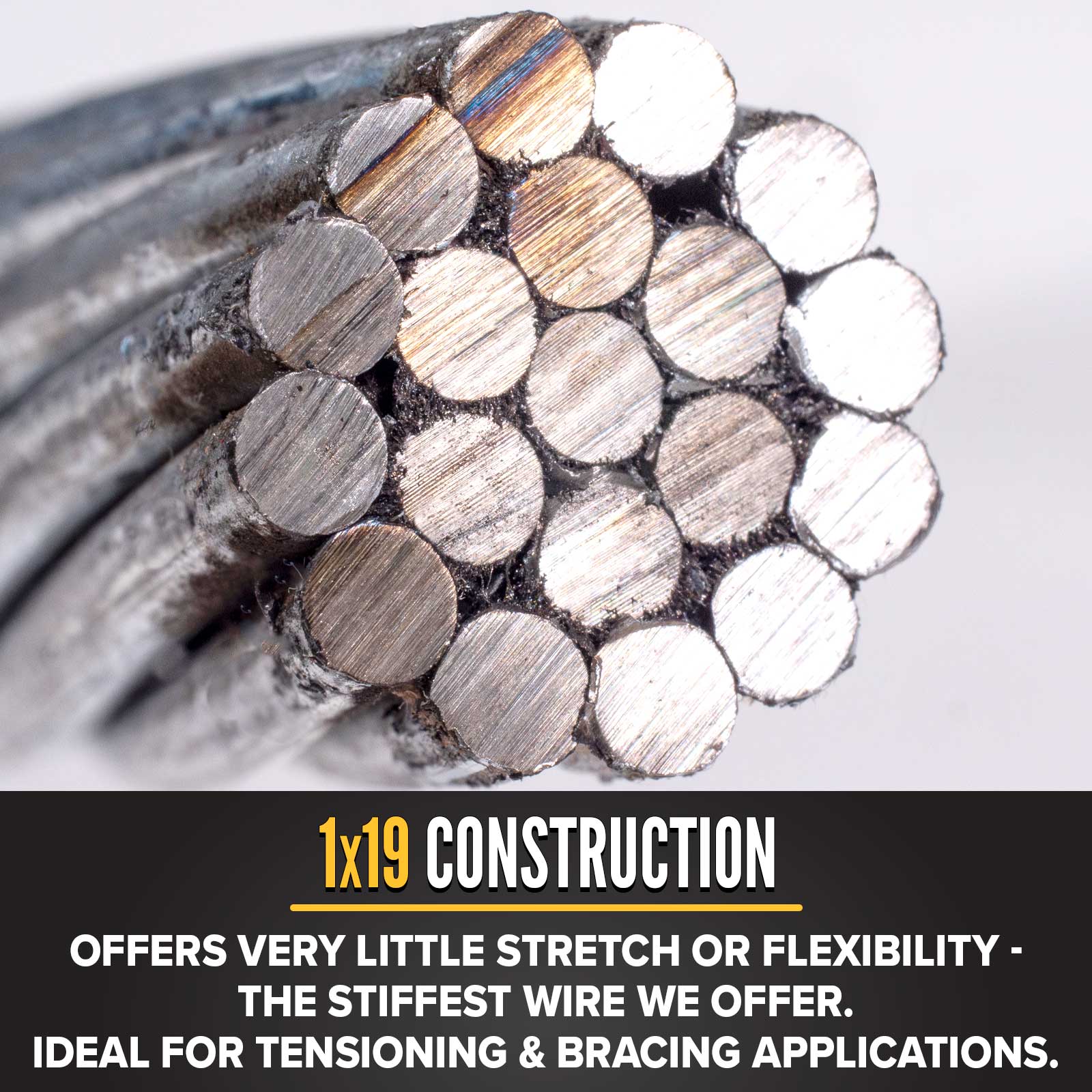 It has a protective galvanized finish for added strength and protection from corrosive elements, and the 1x19 construction provides resistance to compressive forces and a slightly higher flexibility than our 1x7 guy wire.