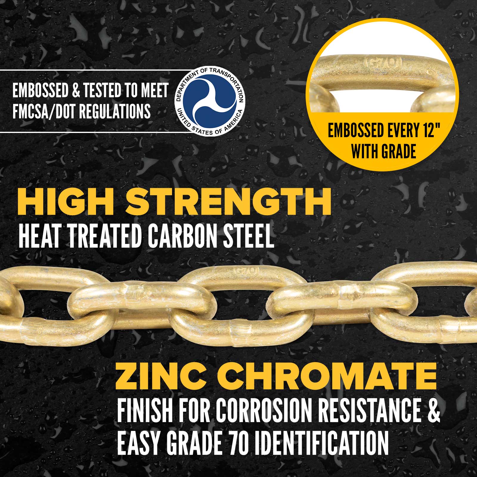 All of our transport chain is DOT compliant and meets or exceeds FMCSA CFR49 Section 393.104 and NACM Welded Steel Chain Specifications. The chain is embossed with proper grade 70 markings on the links for stress-free inspections.