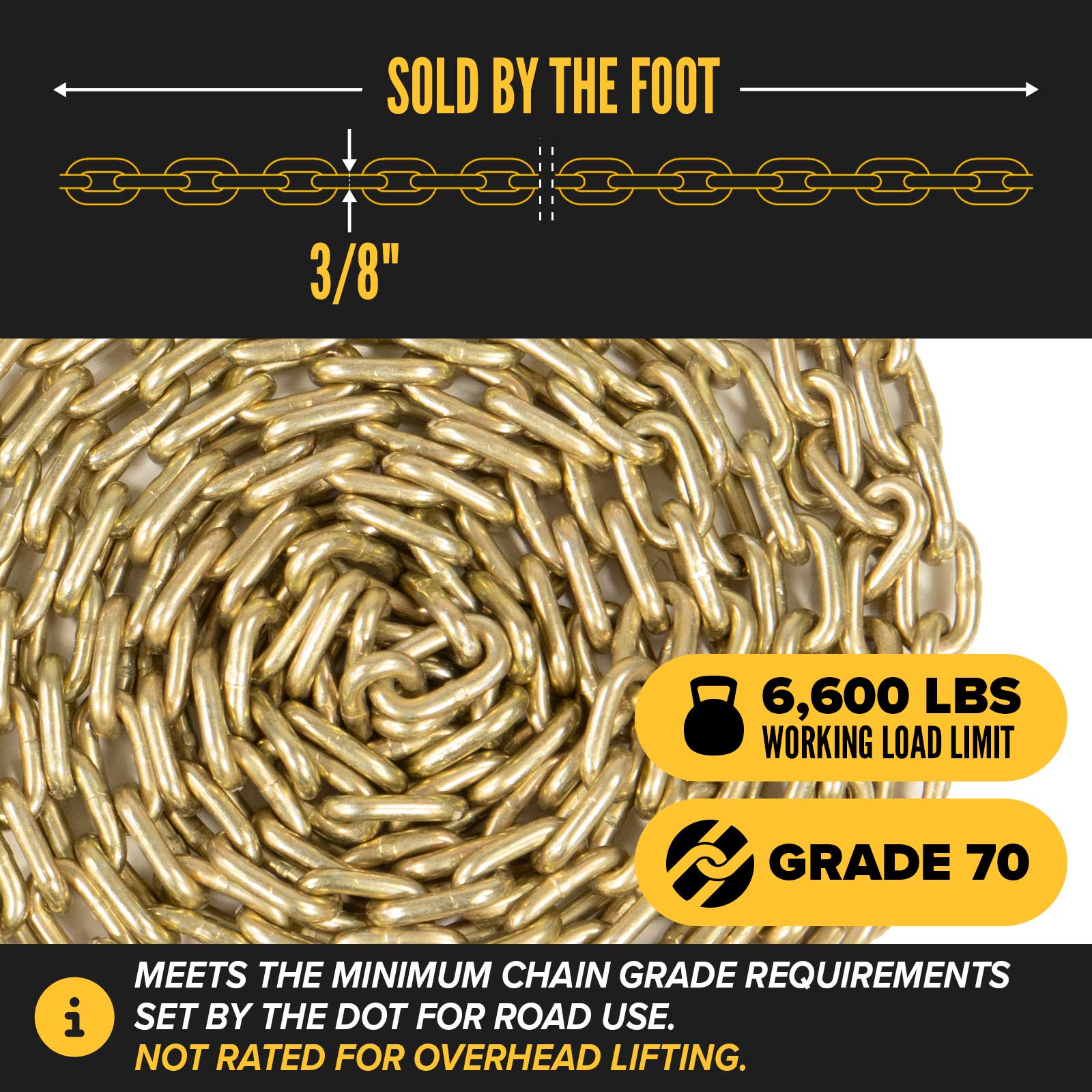 It has a yellow zinc chromate finish that conforms to ASTM B633 Type II for corrosion protection and quick identification as G70 chain.