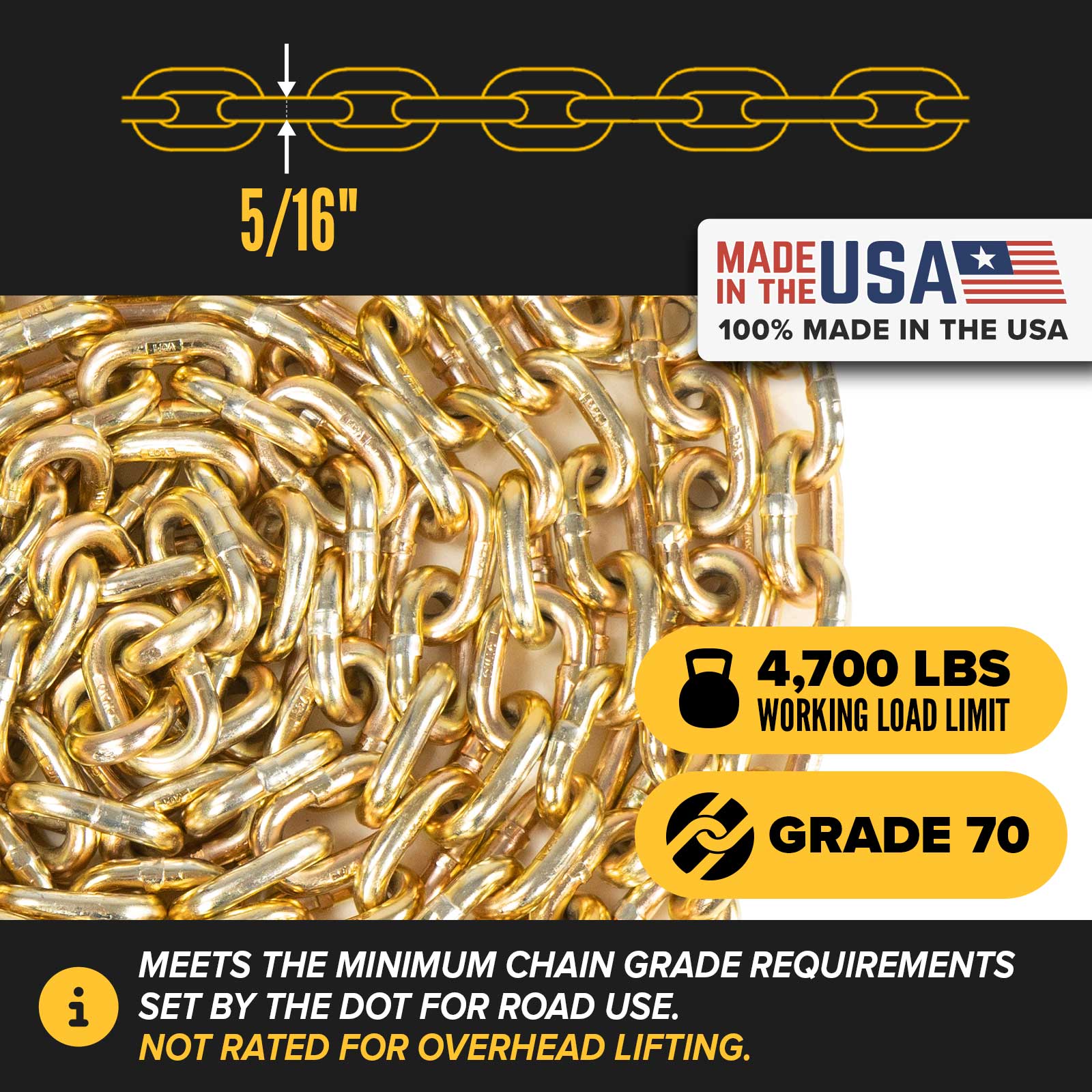 Standard link grade 70 transport chain is made in the USA by trusted manufacturer Columbus McKinnon using high-strength carbon steel for superior quality and strength. Heat-treated and strength-tested, it's excellent for use as tie down chain when combined with grade 70 hooks.