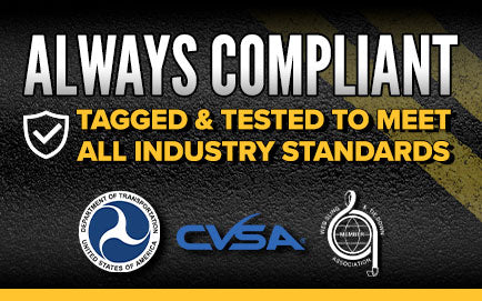 All of our tie-down straps are tagged & stenciled with working load limit to meet FMCSA and DOT regulations, CVSA and WSTDA guidelines, and North American Cargo Securement standards. All straps are tested to meet or exceed all required standards so there's never a question of compliancy.