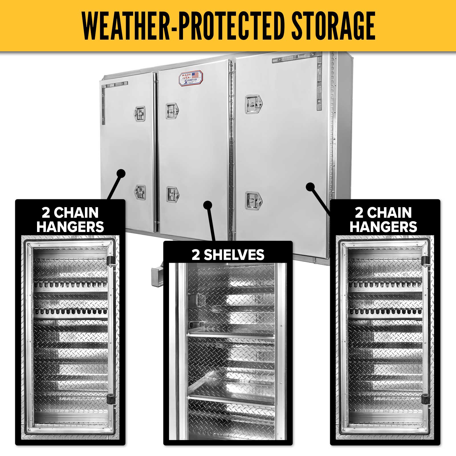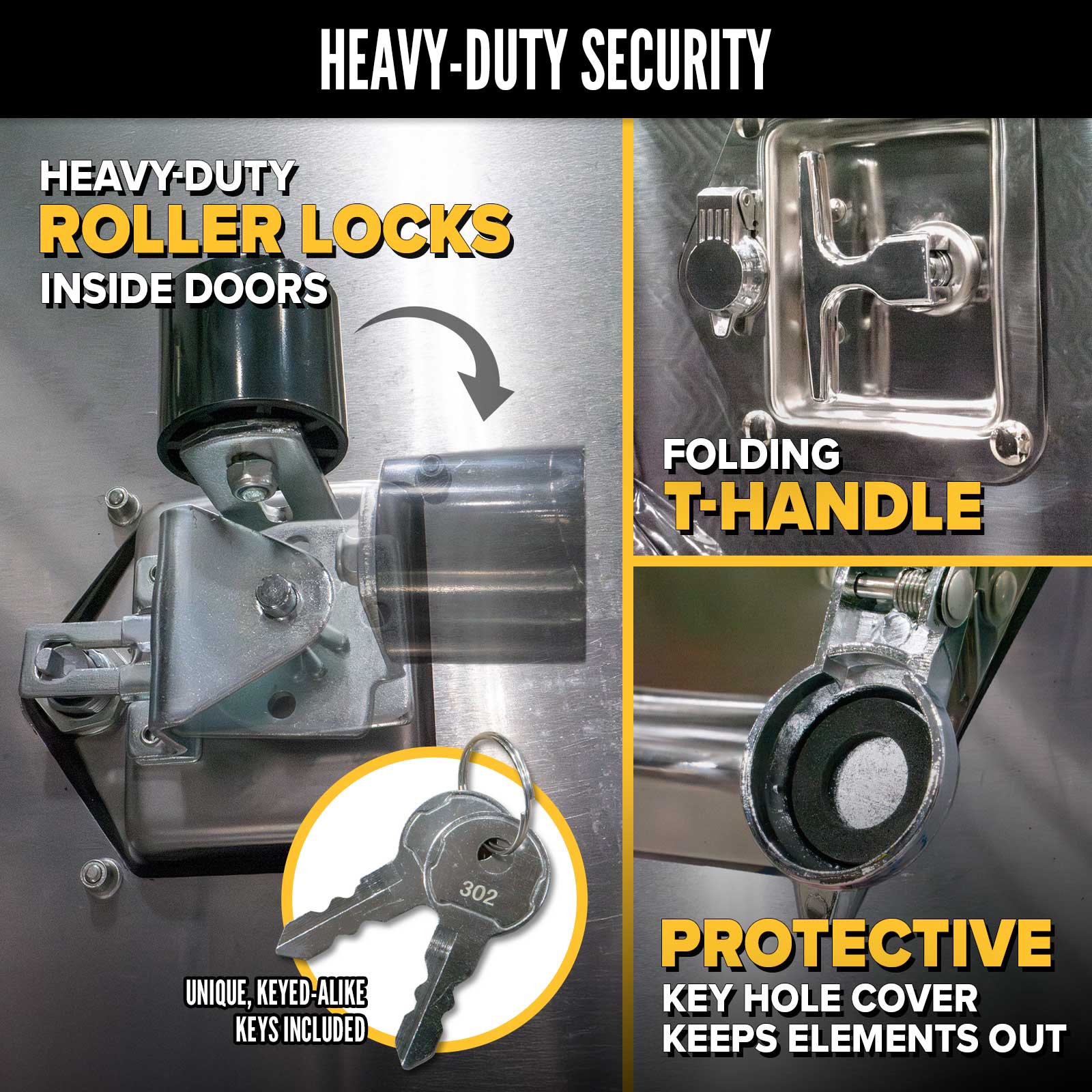 Each storage vault features a continuous, weatherproof seal around the entire door perimeter, keeping rain, dust, and debris out. A built-in drainage hole prevents condensation and clears any water that may sneak in, ensuring your cargo stays dry. Finally, heavy-duty roller locks provide rock-solid security, so you can hit the road knowing your equipment is safe and protected.