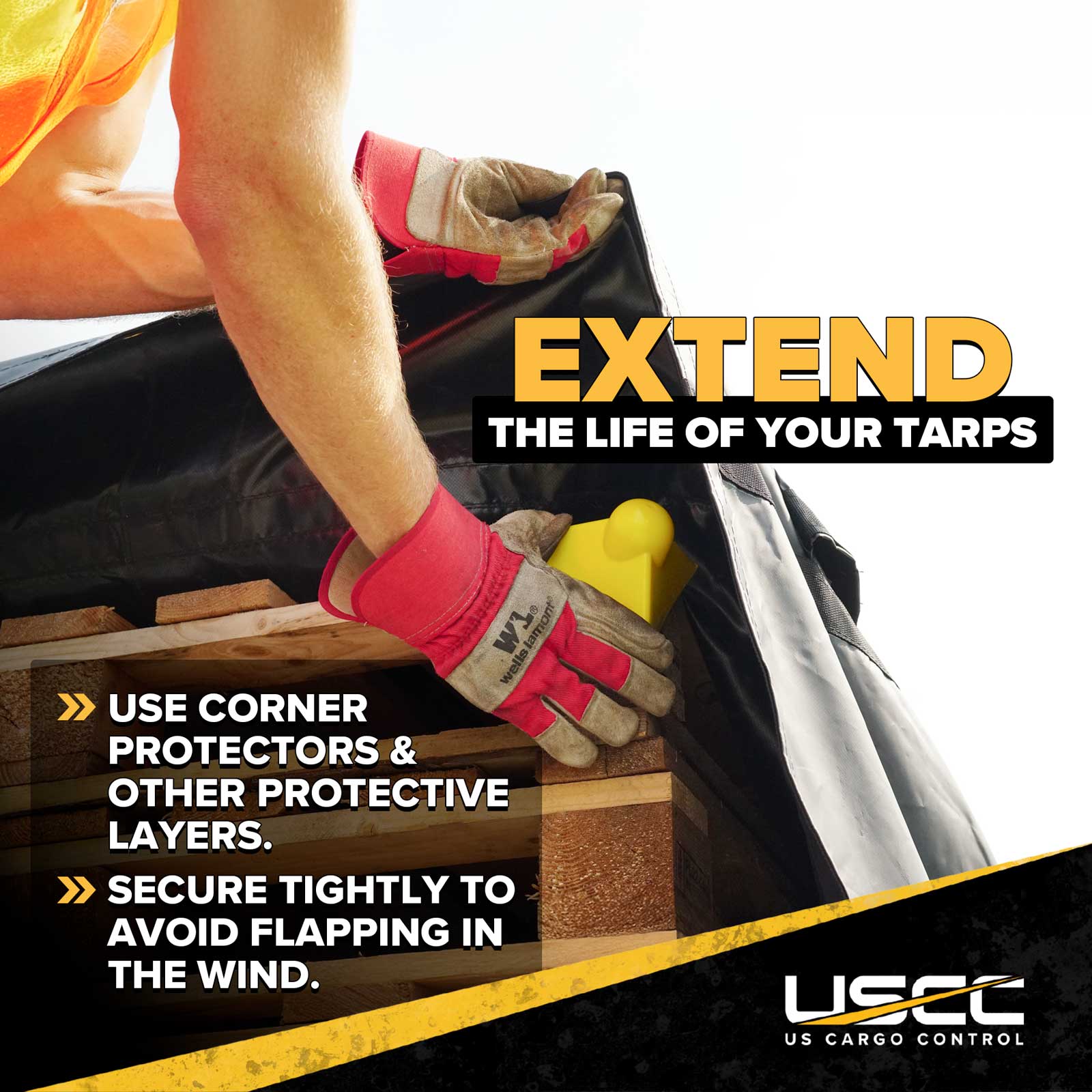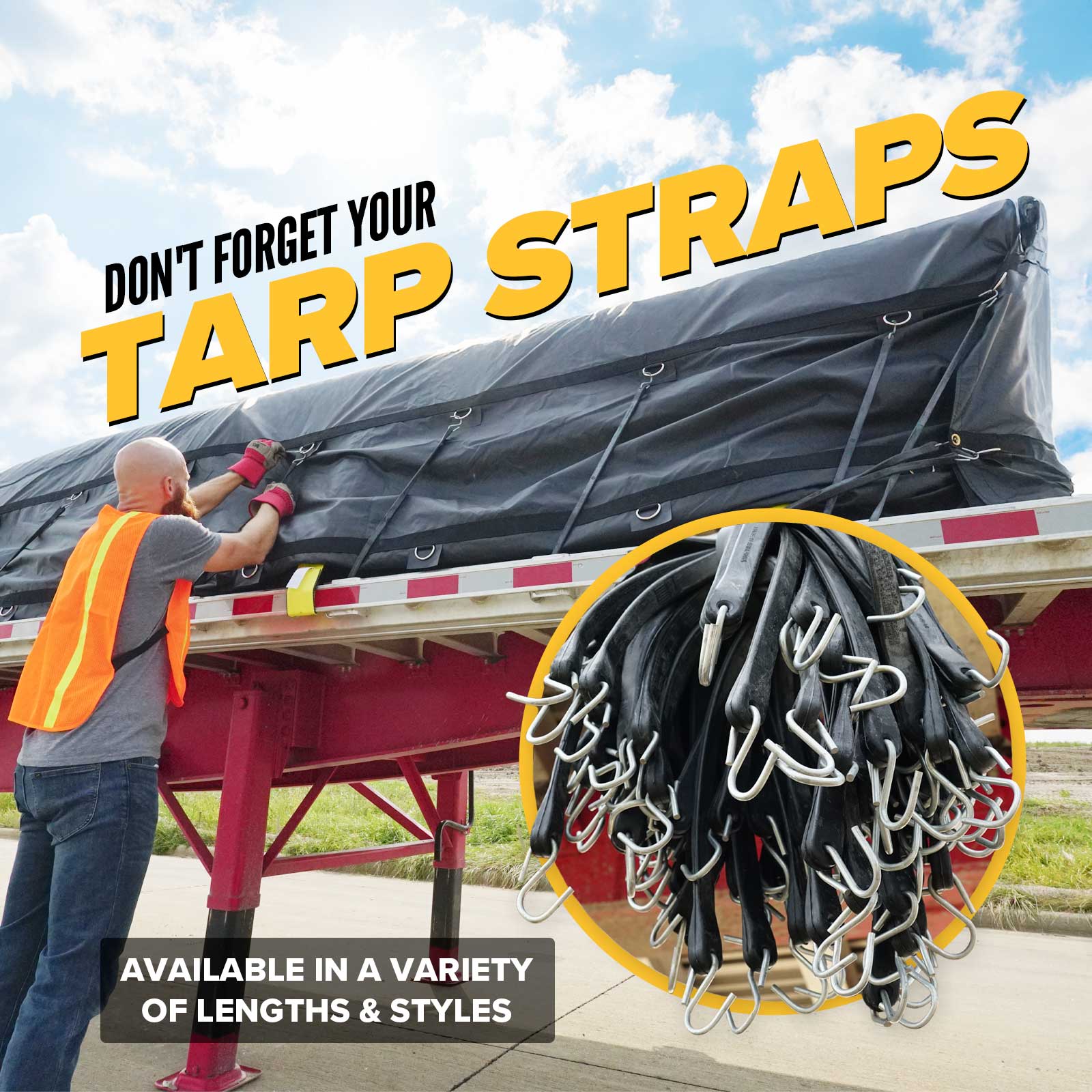 Make sure you check out our other flatbed trailer products - for each tarp, we recommend a box of 50 rubber tarp straps, tarp corner protectors, and moving blankets to both protect the tarp and help it slide over the load more easily.
