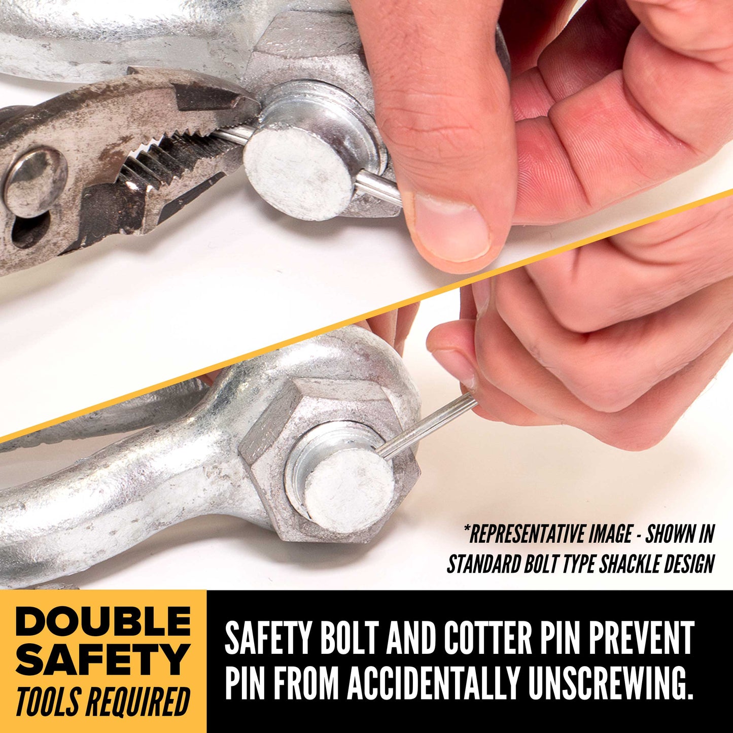 Bolt type anchor shackles are intended for long-term installation or permanent installation, or if there’s a risk of a load sliding on the shackle pin, which can cause it to rotate. The bolt style system prevents sliding loads from turning and backing the pin out of the shackle.