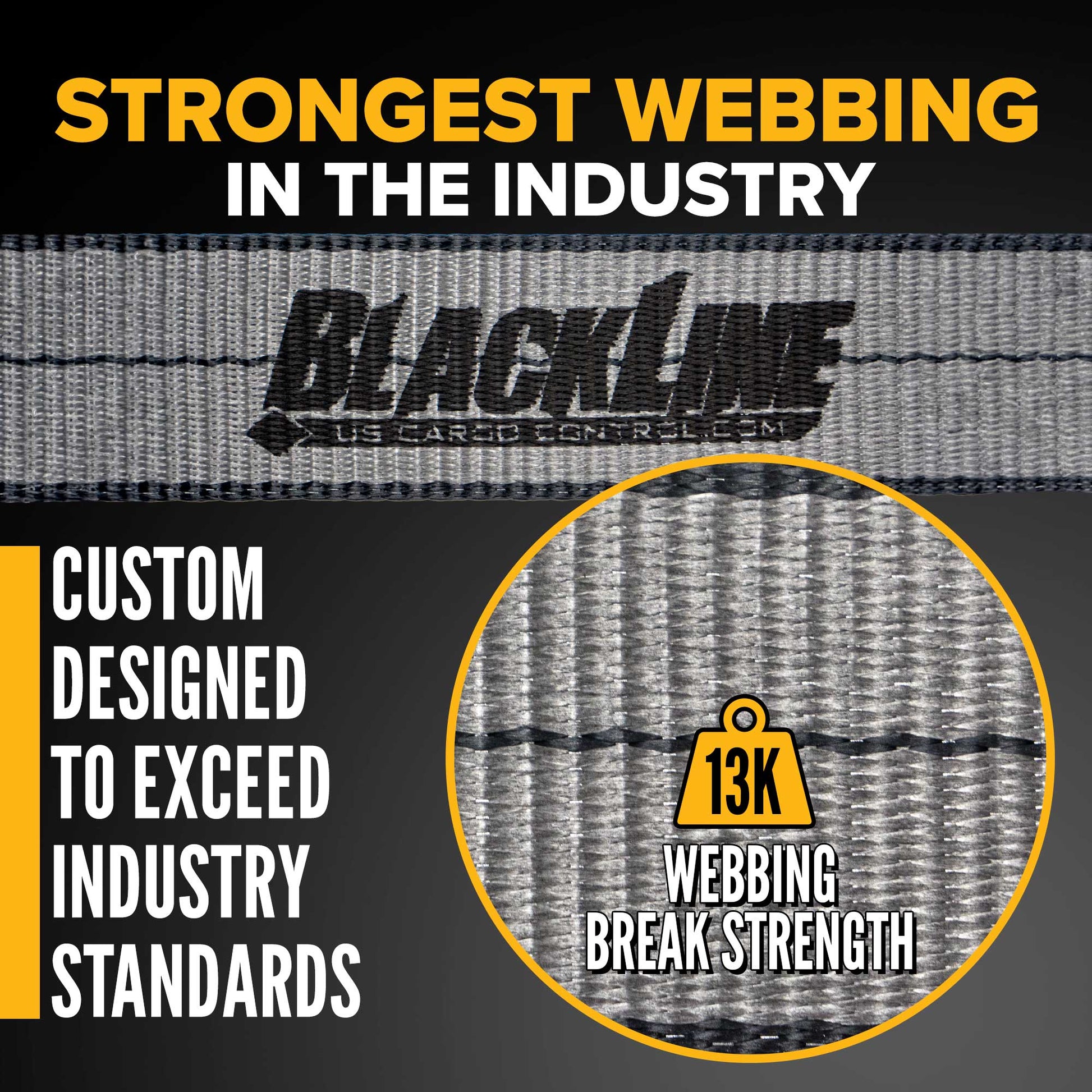 Industrial-Grade Webbing: The webbing break strength of 13,000 lbs. is stronger than 12,000 lbs. for typical 2" webbing. The yarn is thicker than that offered by most competitors, with more picks per inch used to create each strap.