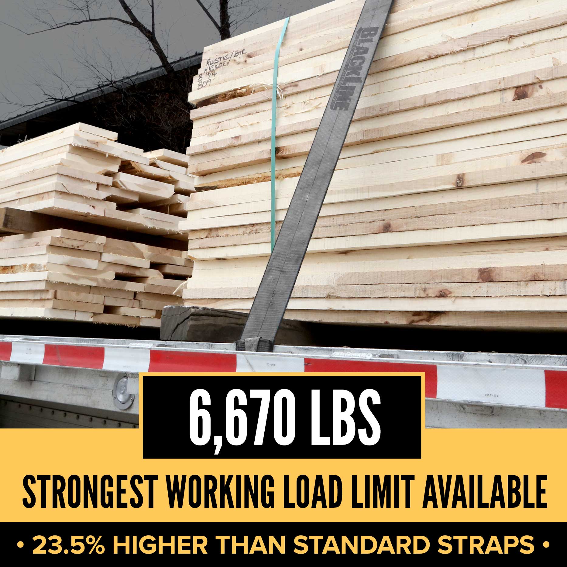 Our 4" wide heavy-duty ratchet straps are made to last. Constructed from industrial-strength webbing with a break strength of 24,000 lbs., they have a working load limit of 6,670 lbs., 23.5% higher than our standard 4" straps!