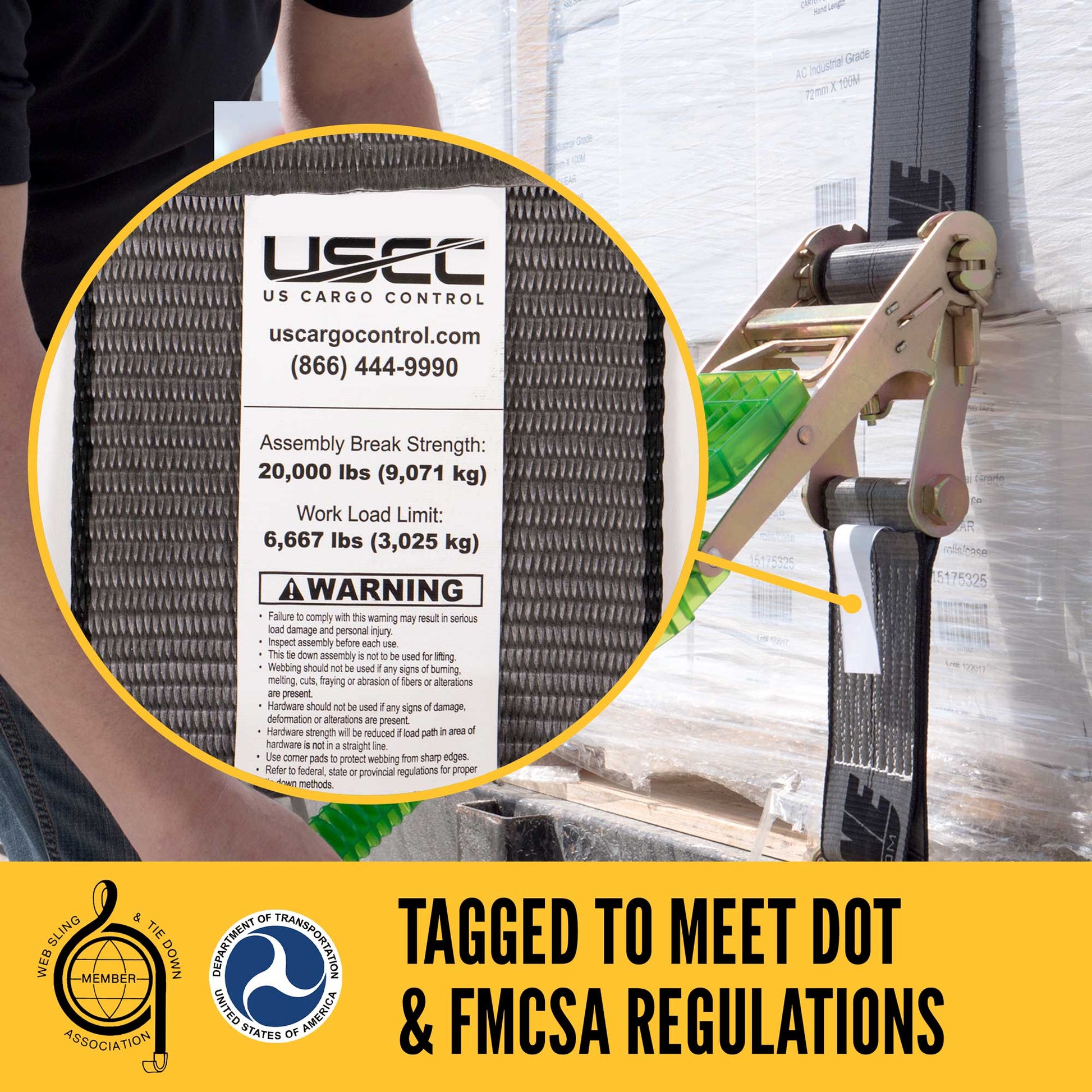 This 4 inch ratchet strap is tagged with the working load limit to meet CVSA guidelines, FMCSA and DOT regulations, and WSTDA, CHP and North American Cargo Securement standards.