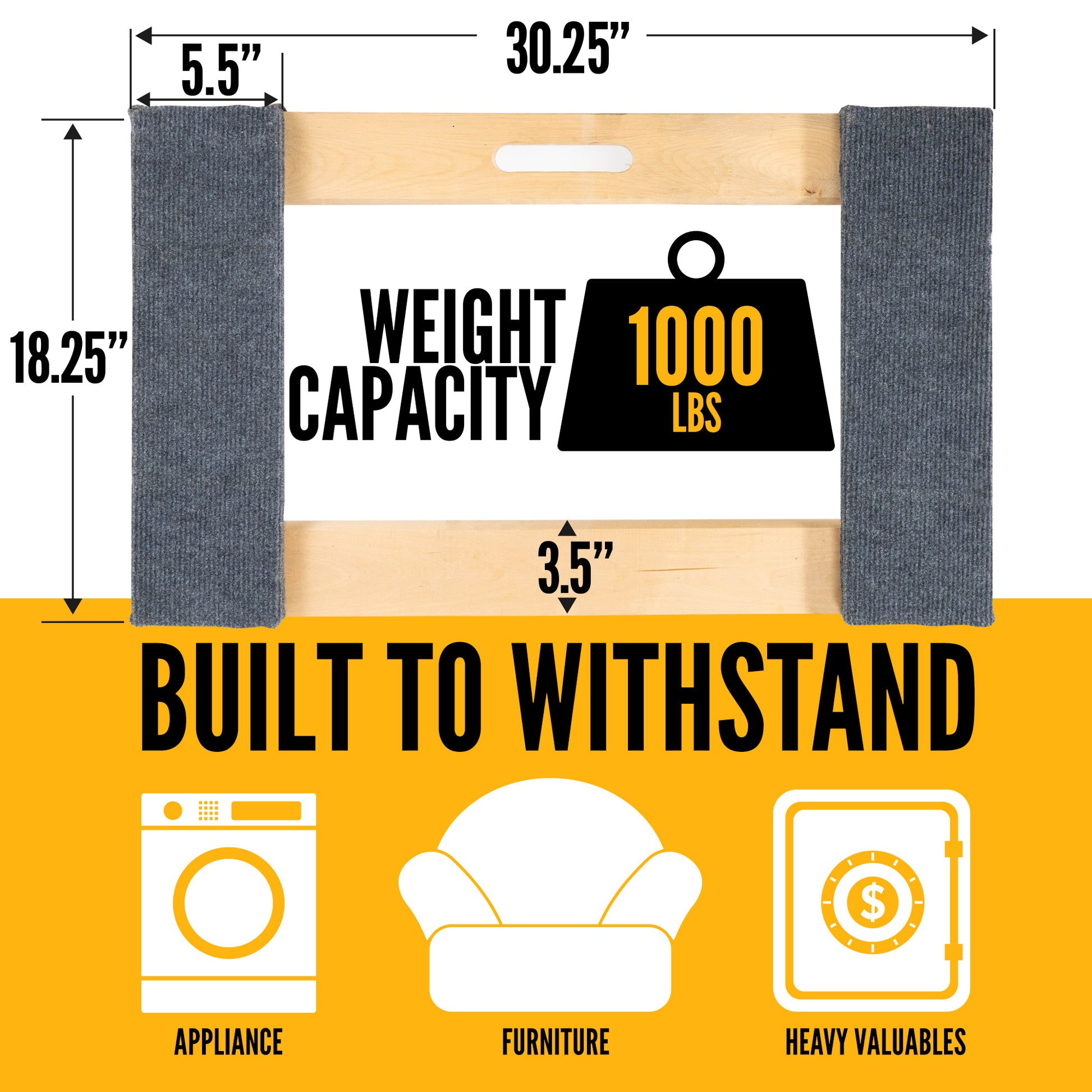 18"x 30" mover's dolly holds up to 1,000 lbs., making it easy to transport heavy and bulky items, appliances, boxes and more. Carpeting on the two raised ends offers cushioning and grip while also protecting walls and door frames from scuffs and scratches. Rugged 4" appliance dolly swivel wheels are non-marking so they're safe for carpet, tile, even hard wood floors. A handy cut-out makes it easy to carry.