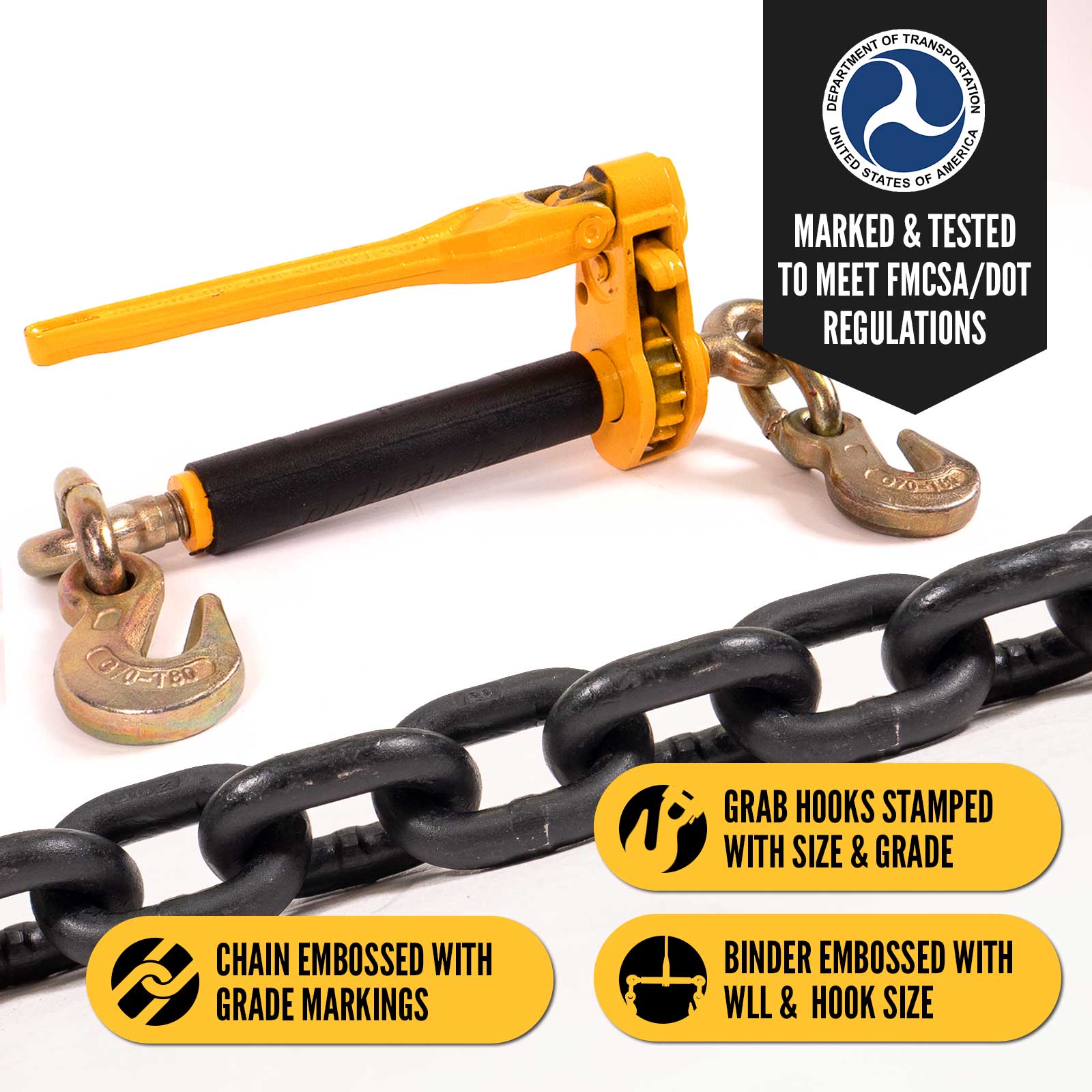 All of our tie down chain is FMCSA / DOT compliant and meets or exceeds FMCSA CFR49 Section 393.104 and NACM Welded Steel Chain Specifications, while all of our chain binders are FMCSA / DOT compliant and meet or exceed WSTDA T-6 Recommended Standards. All of the hooks (on both the tie down and the binder) are embossed with the size and the grade, the chain has grade embossing on the links, and the binder includes the working load limit and a traceability code. This ensures quick identifications and stress-free inspections.