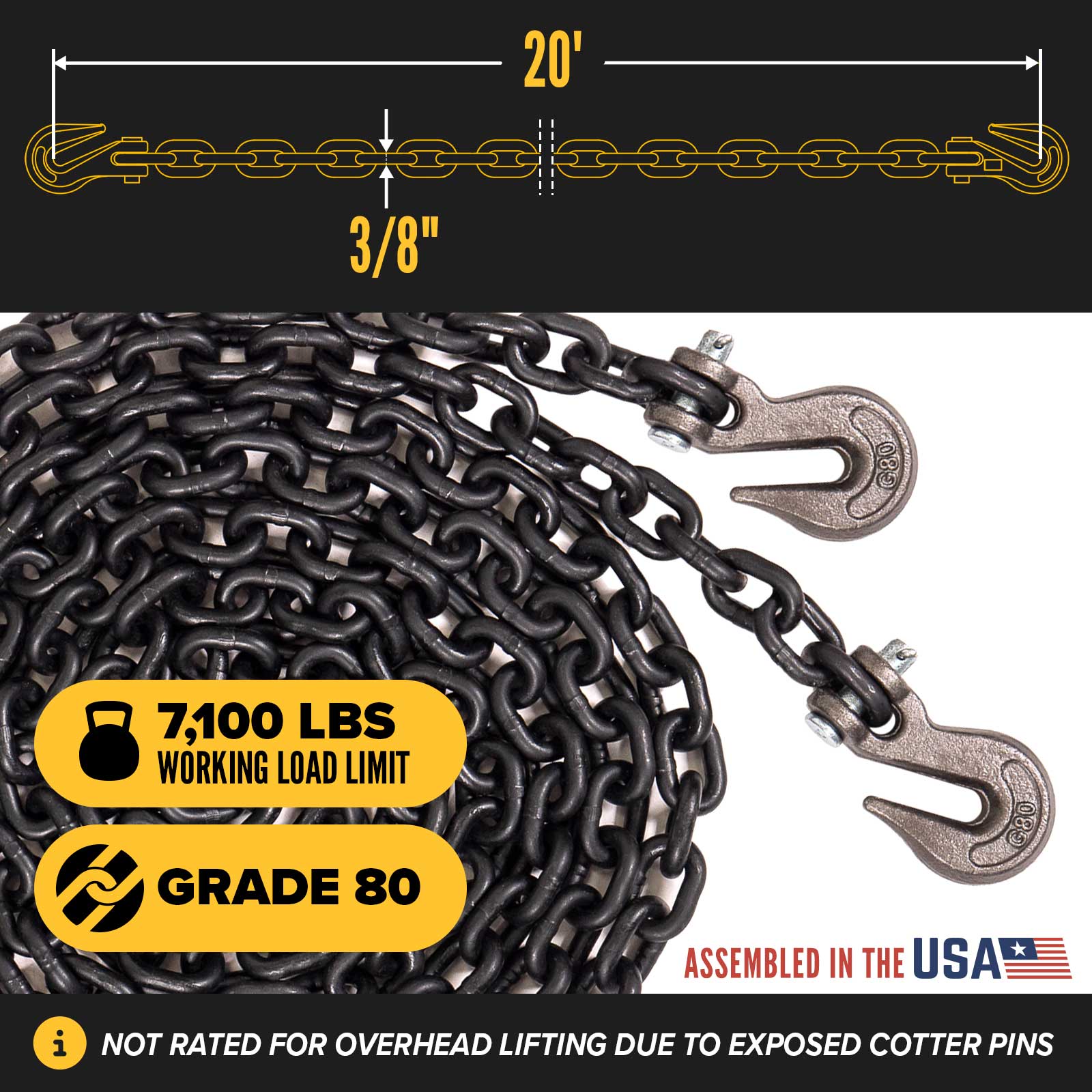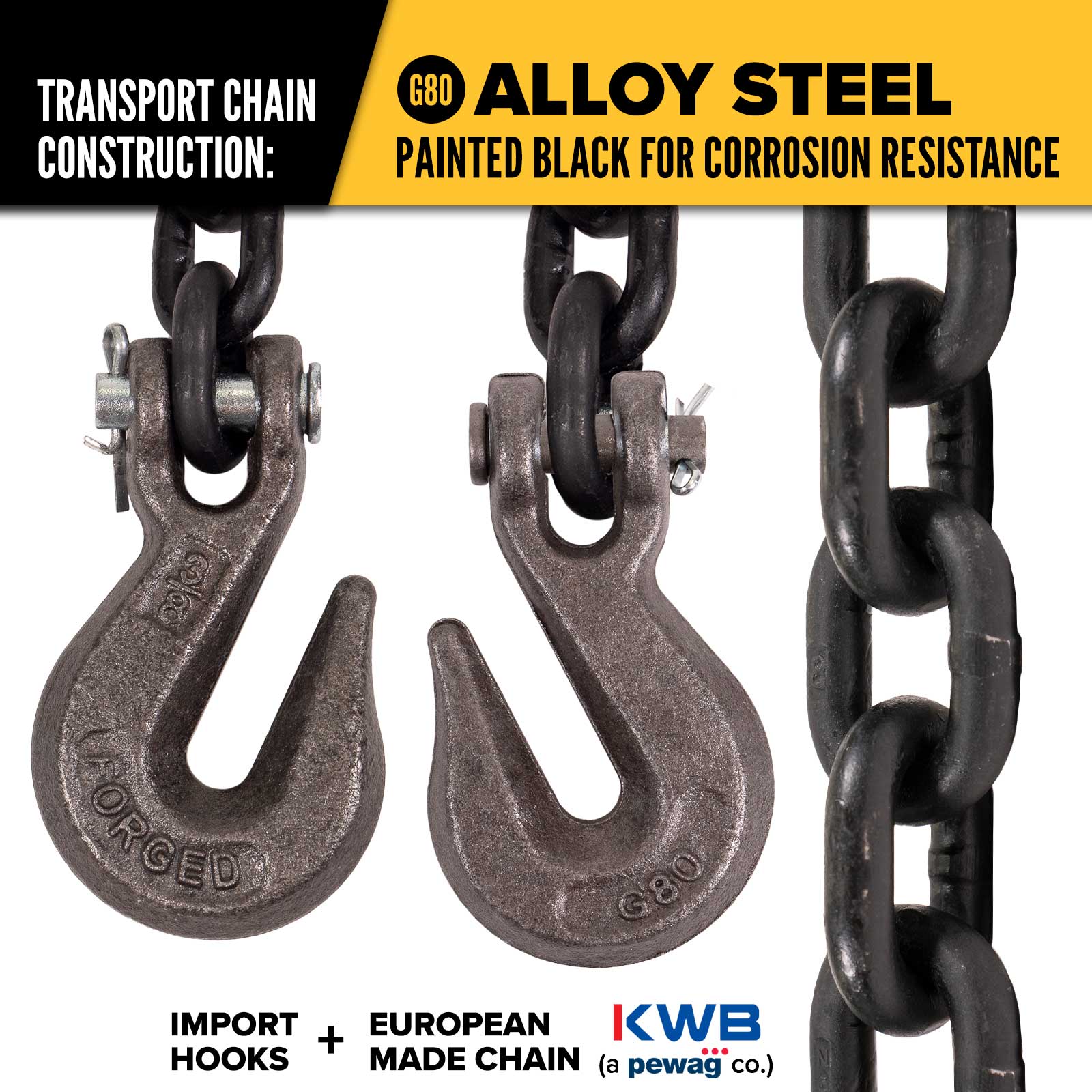 Grade 80 chain offers superior fatigue- and abrasion-resistance compared to grade 70, making it a smart alternate for cargo securement. The chain is black-painted for corrosion-resistance, and the clevis grab hooks on each end have a non-cradle design that allow them to fit through a flatbed trailer rub rail for quick yet secure connections.
