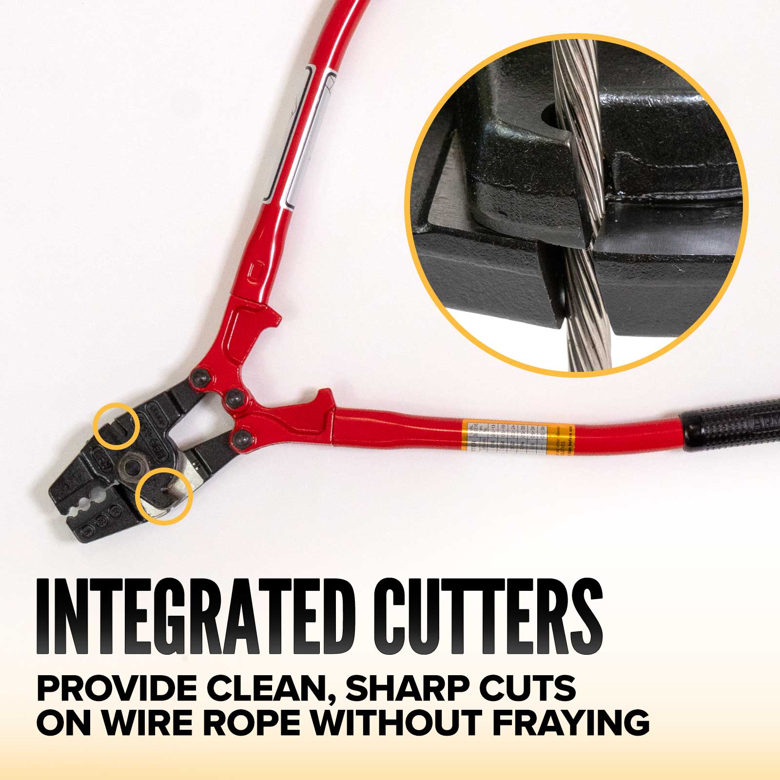 With hardened steel jaws and long, ergonomic handles, this steel cable swage tool delivers the high leverage needed for consistent, fatigue-free crimping. Rubber-coated grips enhance comfort and control, even during extended use, while the compact frame lets you work efficiently in tight spaces. The built-in cutter delivers clean, precise cuts on wire rope, preventing fraying and ensuring a professional finish.