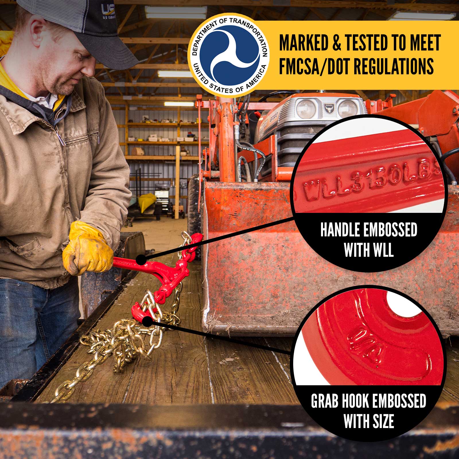 All of our chain binders are FMCSA / DOT compliant and meet or exceed WSTDA T-6 Recommended Standards. The working load limit and traceability code are embossed on the handle / body and the hooks have grade and size markings. This ensures quick identifications and stress-free inspections.