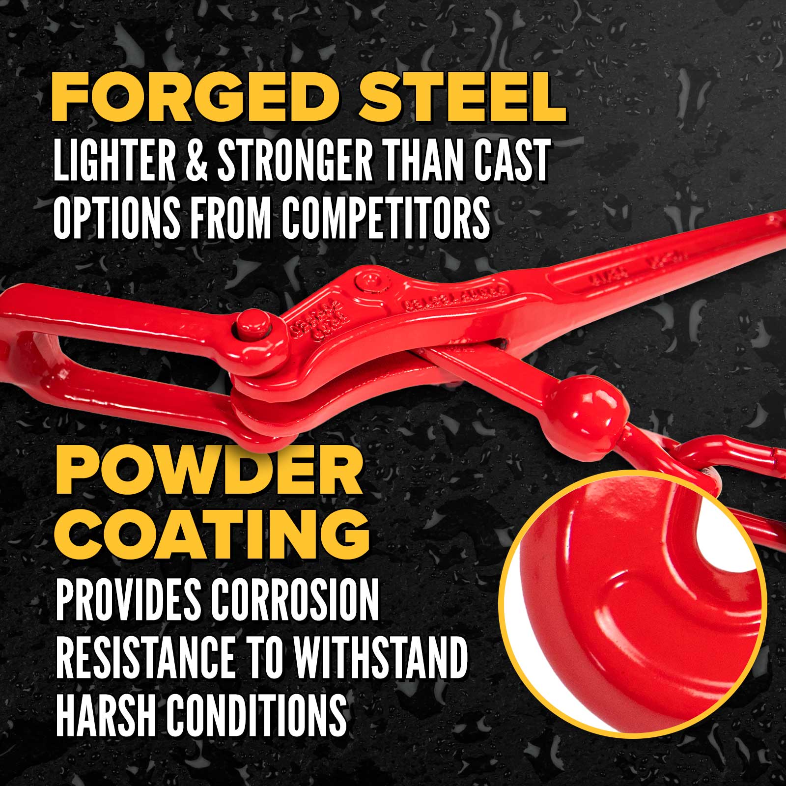 This lever load binder has a forged carbon steel body and handle. The forged steel is more durable than a cast handle - it can withstand much more force without breaking and ensures maximum leverage. Ours uses slightly larger threads than most of our competitors as well for a more heavy-duty hold.