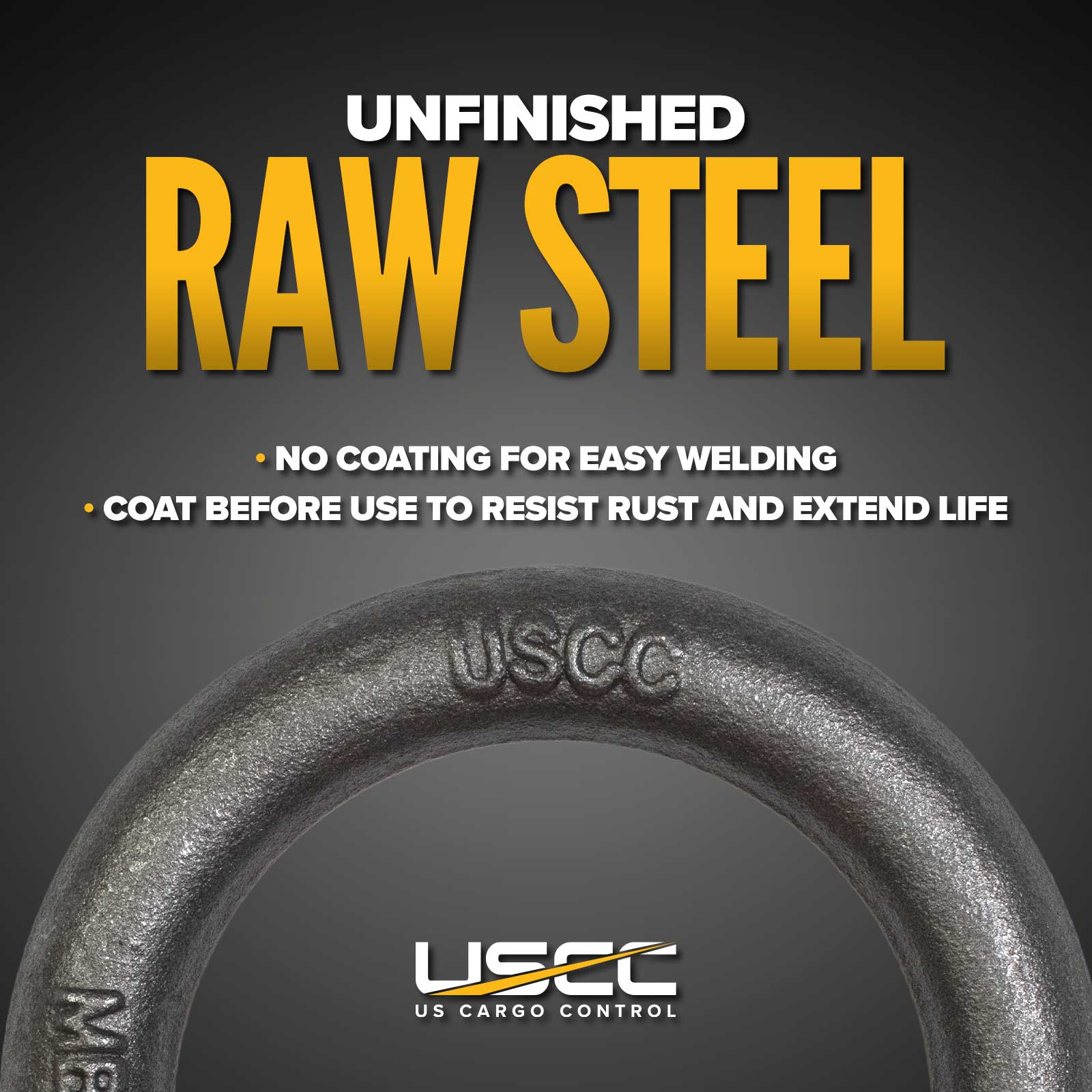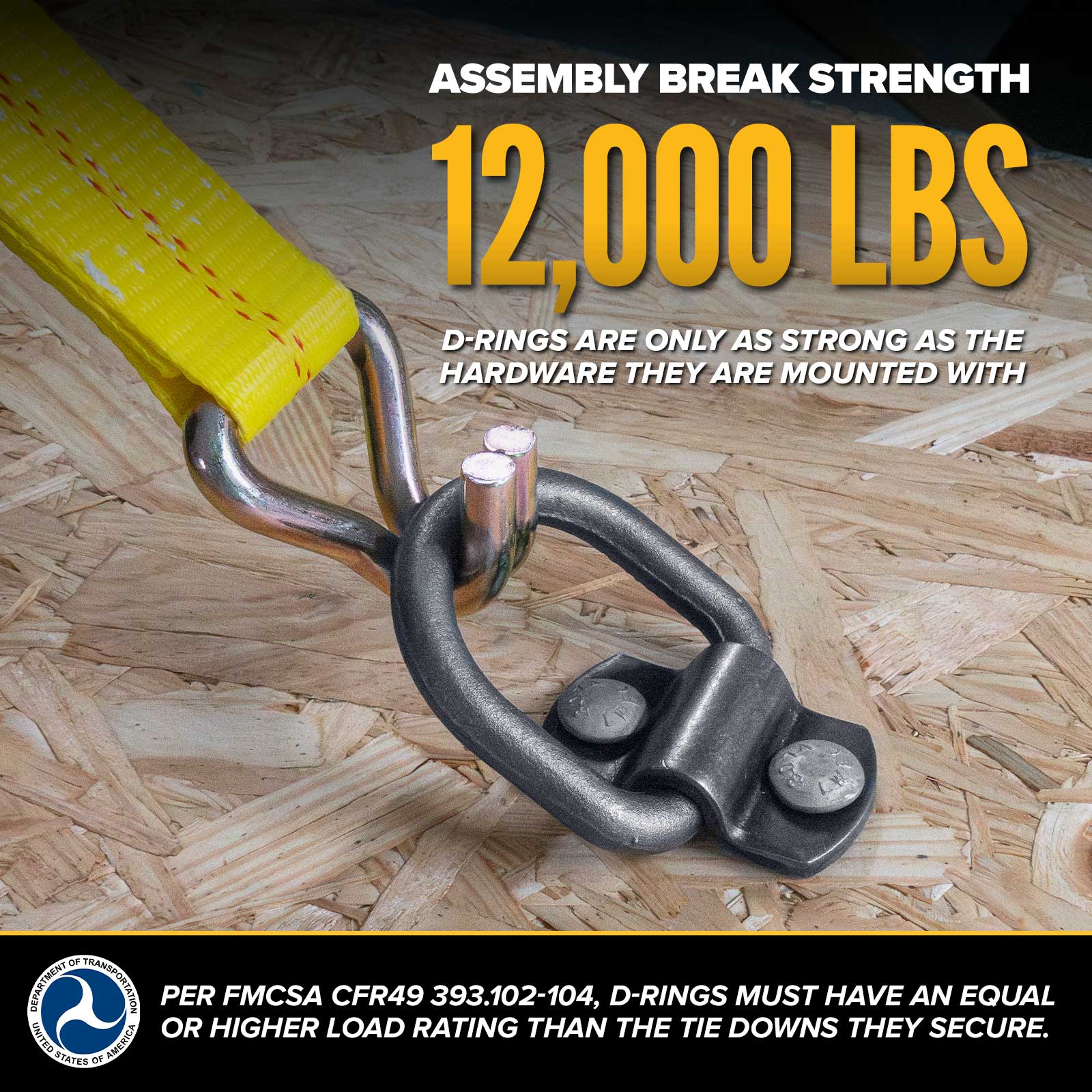 This D-ring can be either bolted or welded on, and comes with pre-drilled holes for easy mounting. Because D-rings are only as strong as the hardware they are mounted with, best practice is to bolt all the way through the material they are mounted to to achieve the highest strength.