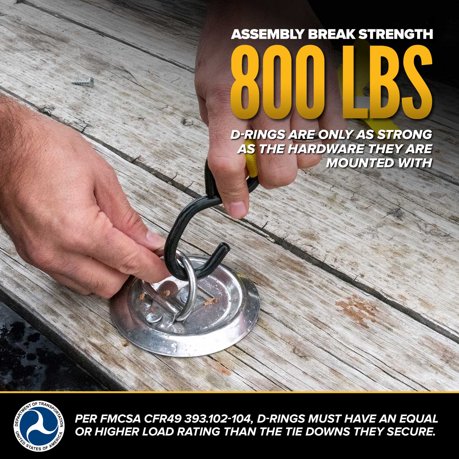 Bolt-on D-rings come with pre-drilled holes for easy mounting. Because D-rings are only as strong as the hardware they are mounted with, best practice is to bolt all the way through the material they are mounted to to achieve the highest strength.