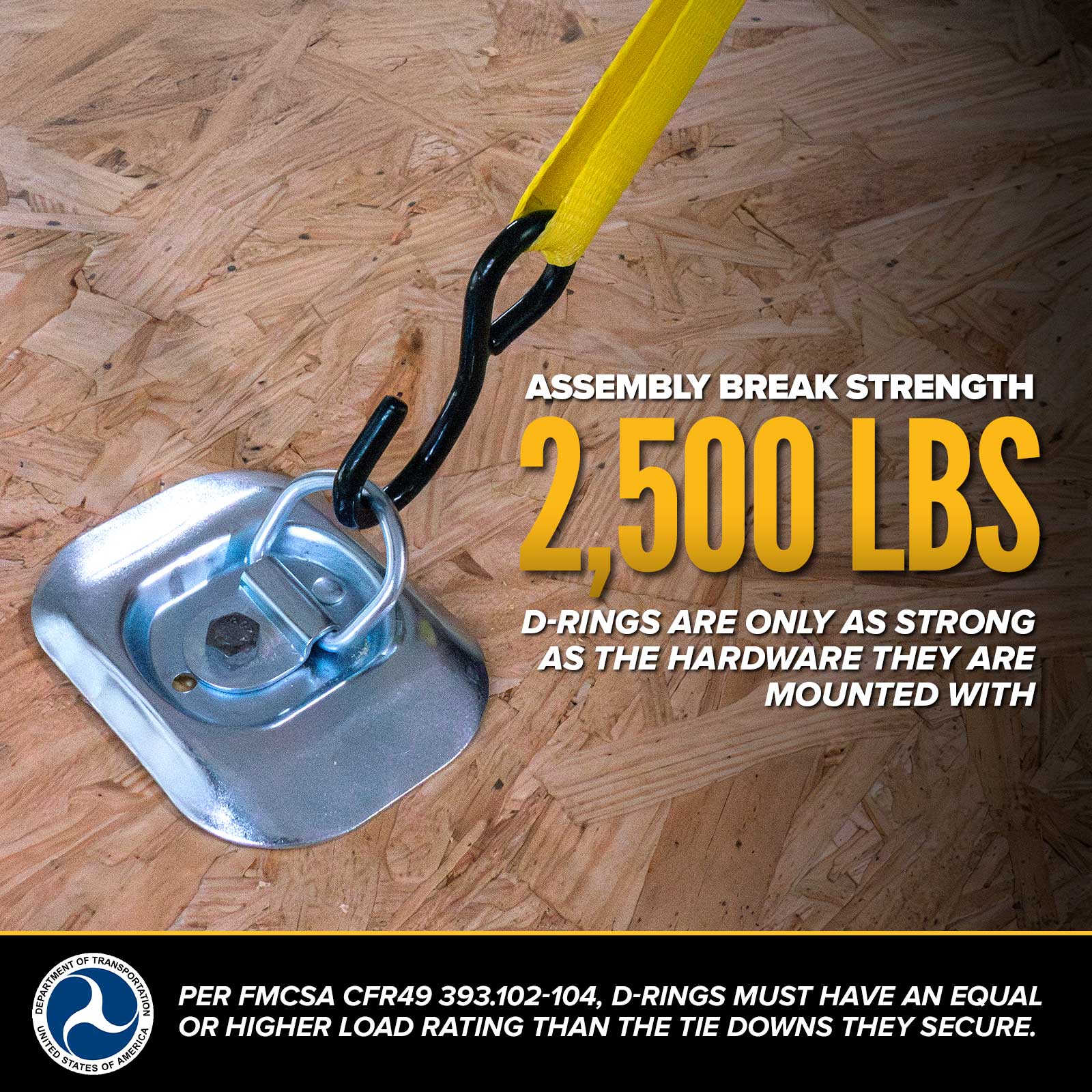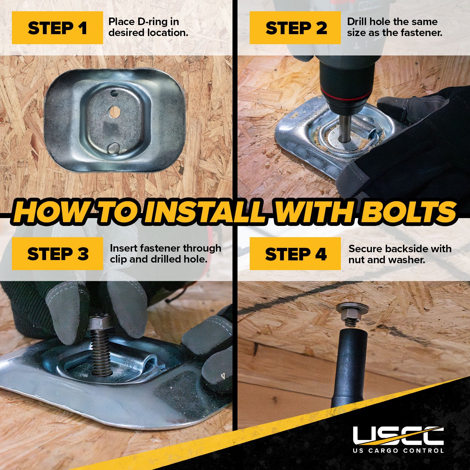 Bolt-on D-rings come with pre-drilled holes for easy mounting. Because D-rings are only as strong as the hardware they are mounted with, best practice is to bolt all the way through the material they are mounted to to achieve the highest strength.