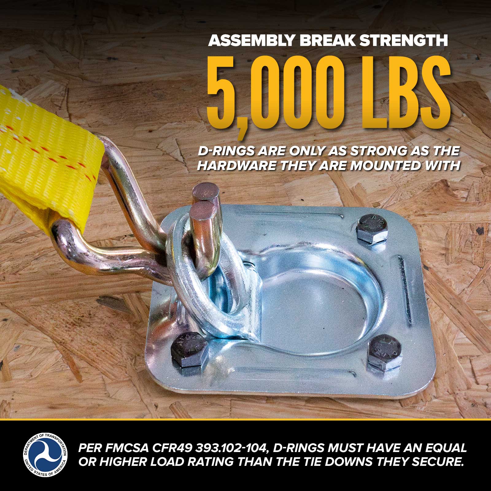 Our recessed D-rings come with pre-drilled holes for easy mounting, but because these are designed to recess into the floor, you will need to cut a hole to fit the plate flush. And since D-rings are only as strong as the hardware they are mounted with, best practice is to bolt all the way through the material they are mounted to to achieve the highest strength.
