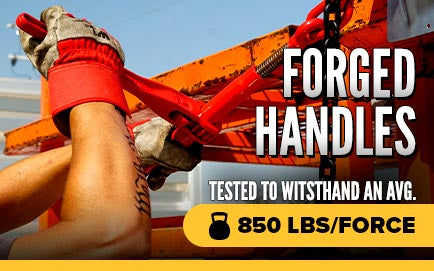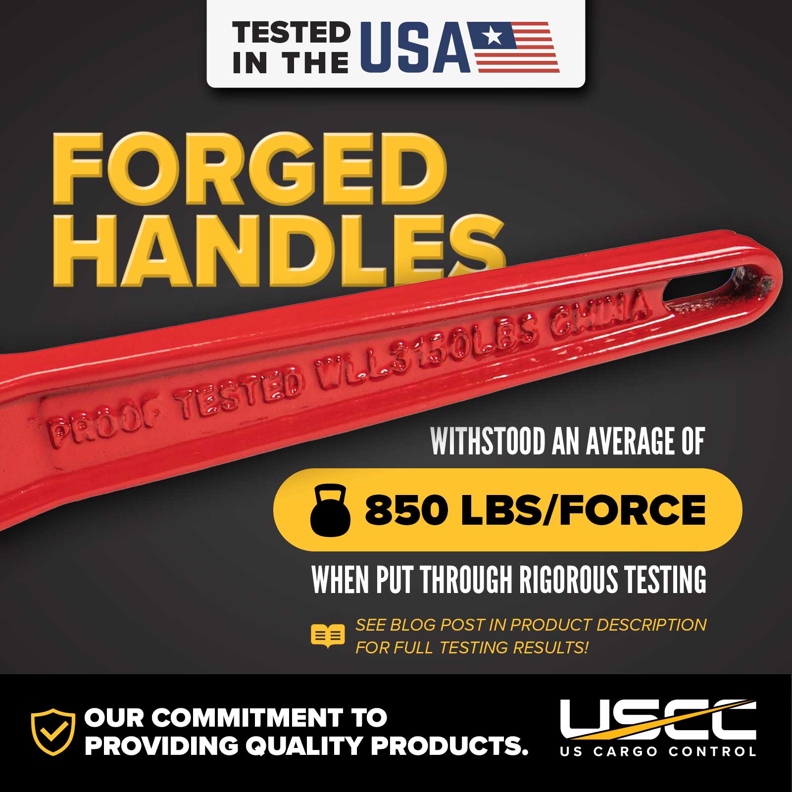 This ratchet load binder has a forged carbon steel body and handle. The forged steel is more durable than a cast handle - it can withstand much more force without breaking and ensures maximum leverage. Ours uses slightly larger threads than most of our competitors as well for a more heavy-duty hold.