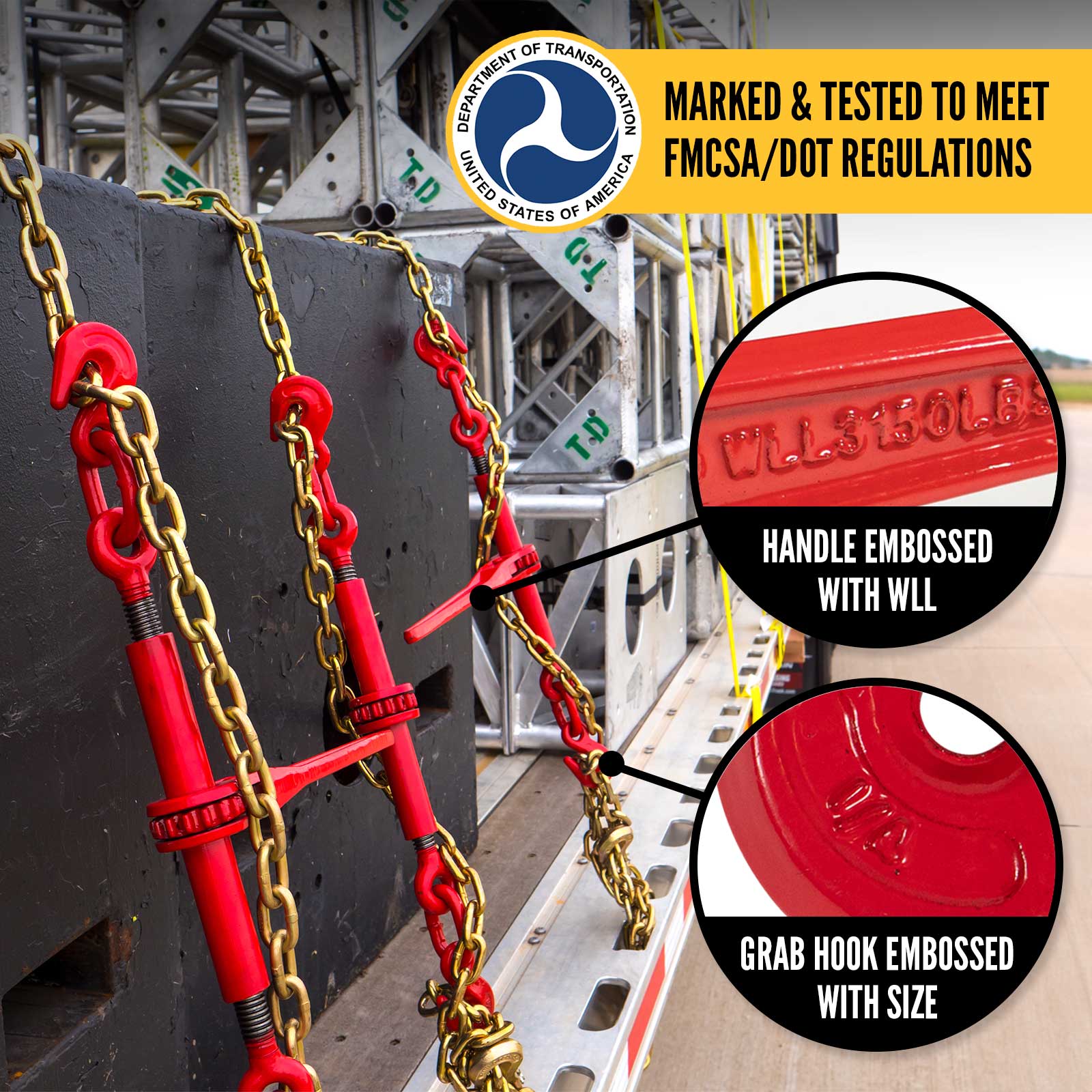All of our chain binders are FMCSA / DOT compliant and meet or exceed WSTDA T-6 Recommended Standards. The working load limit and traceability code are embossed on the handle / body and the hooks have grade and size markings. This ensures quick identifications and stress-free inspections.