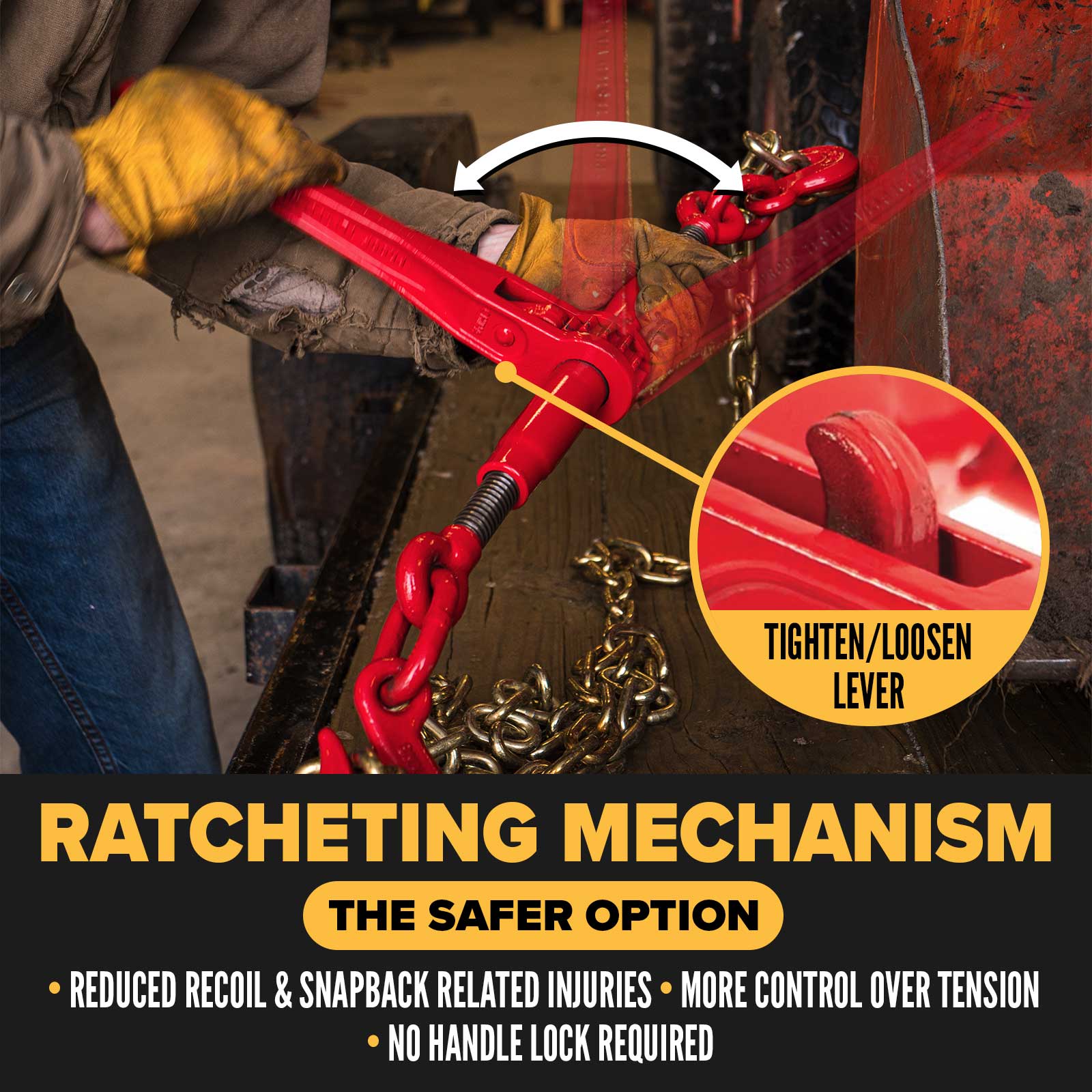 The primary difference between a ratchet binder and a lever binder is the tensioning method. A ratchet binder a ratcheting mechanism instead of leverage to add tension. This is by far the safer option - they store very little kinetic energy in the handle, reducing recoil and snapback-related injuries. They also allow for better control over the tension, as you can make more incremental adjustments, and don't require a handle lock.