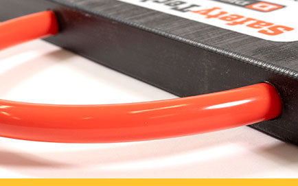 The TuffGrip® handles are guaranteed unbreakable. Constructed of a comfortable, hi-vis material that is waterproof and UV and chemical resistant, these outrigger pads are easy to carry and easy to see. The larger circular pads are also easy to roll.