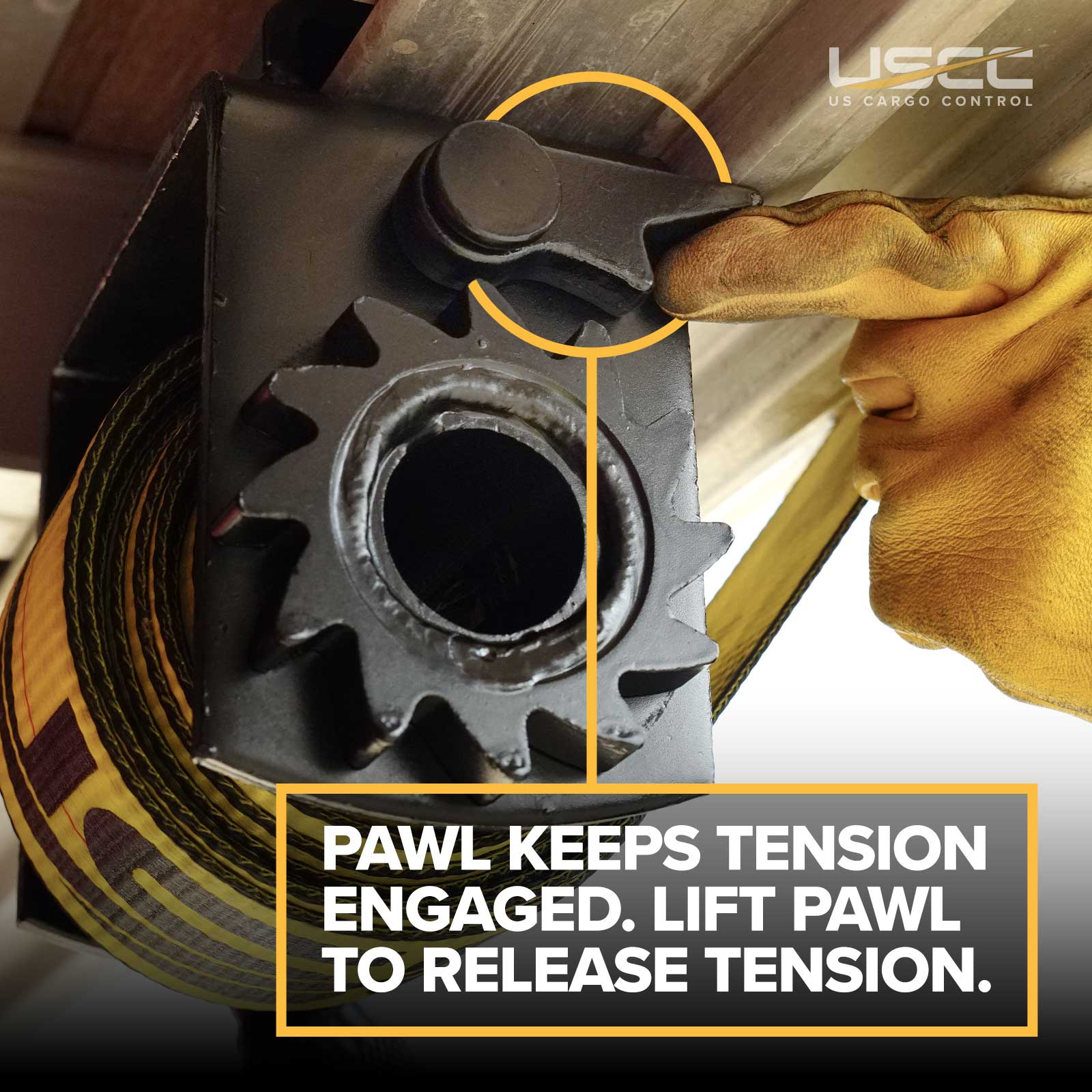 For tensioning, the WSTDA recommends in section 4.3.5 that "When using any winch, the winch mandrel shall have a minimum of two (2) and a maximum of four (4) wraps of webbing. Two to four wraps will appear like four to eight layers of webbing. Less than two wraps may result in strap slippage; more than four will place unnecessary strain on the winch. Excessive straps of webbing on the mandrel may reduce the working load limit (WLL) of the winch and may interfere with proper operation."