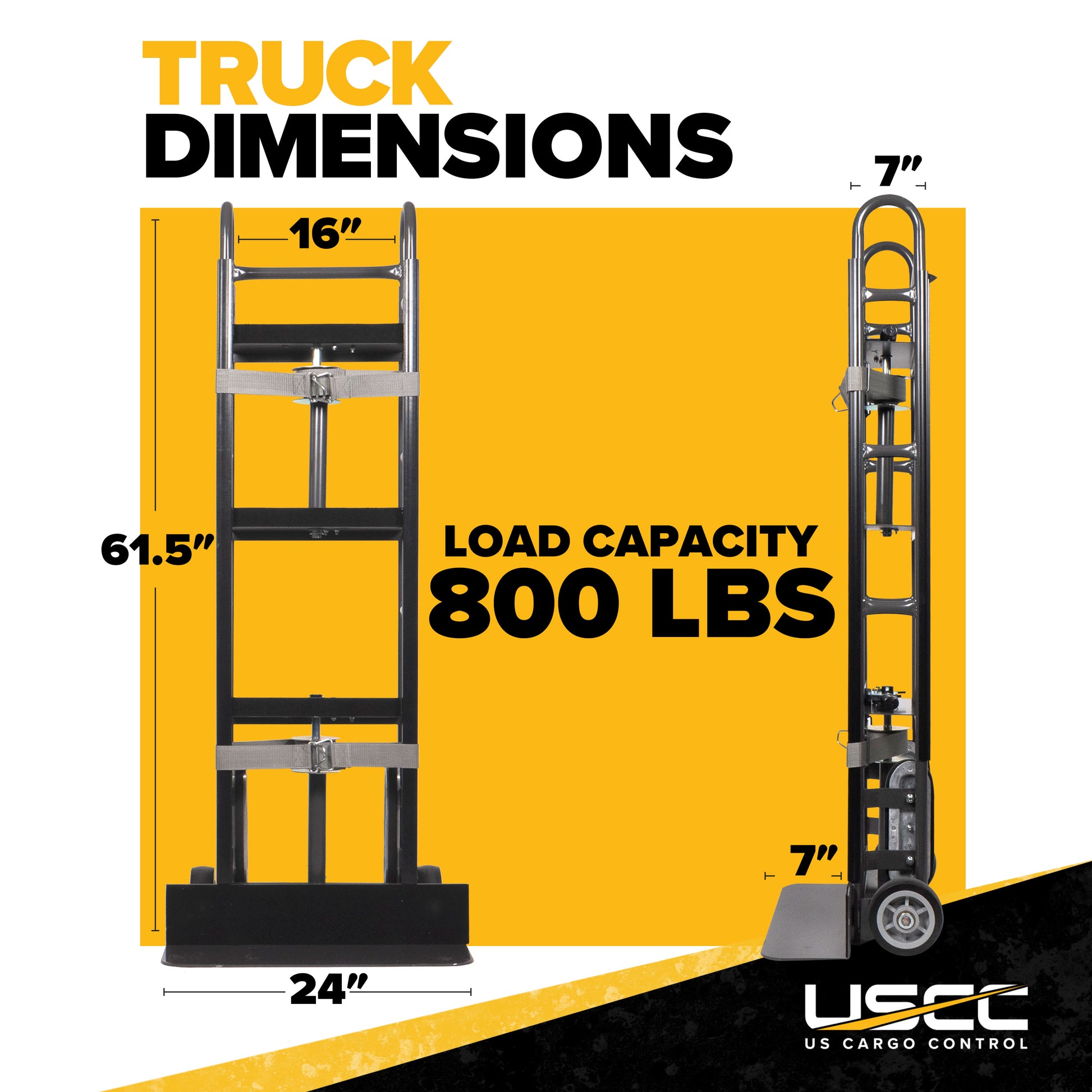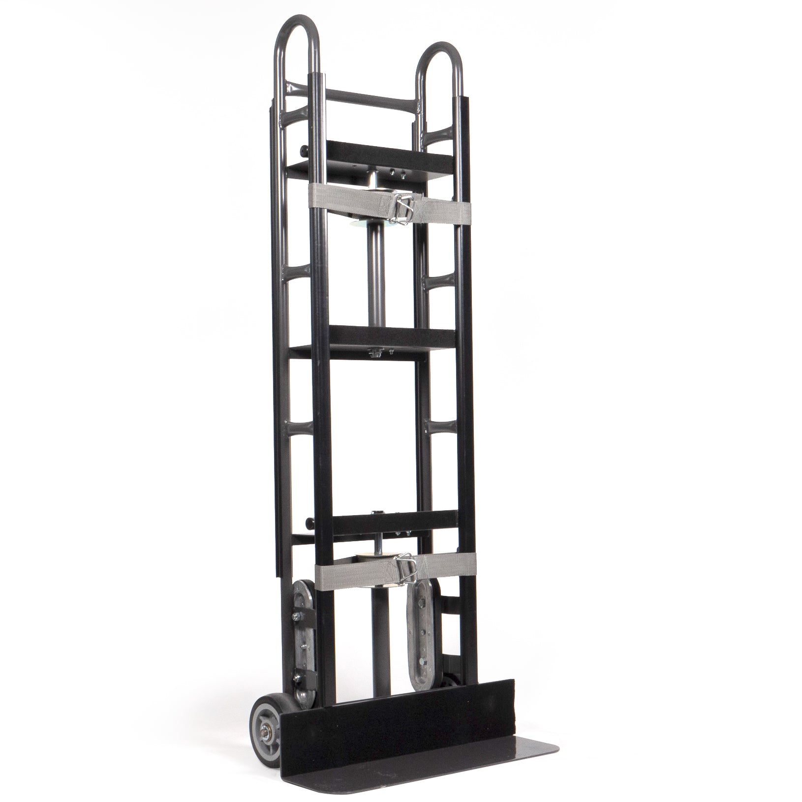 Heavy duty design can handle up to 800 lbs., which is above industry standards for appliance trucks. Key features include a double automatic retractable recoil system, stair climbers, and protective side shields. The 6" thermoplastic rubber (TPR) wheels make it easy to maneuver. Felt trim backing offers extra protection for cargo. Also features an additional hand-hold for use when moving on an incline. Assembly required.