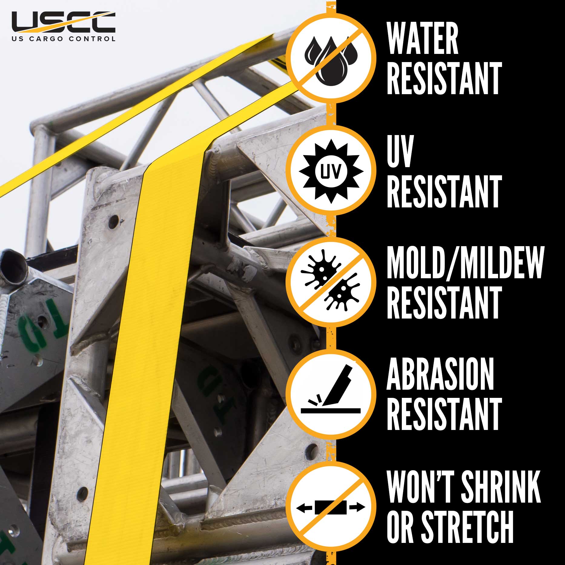 Yellow Polyester Cargo Webbing This polyester webbing comes in rolls 300' long and a variety of colors and strengths. Great for tie-down applications and many others. For other accessories to make your own tie-down assemblies, try our ratchets and cam buckles, flat hooks, and wire hooks categories. If you have any questions, please feel free to contact our sales team professionals and they will gladly assist you.